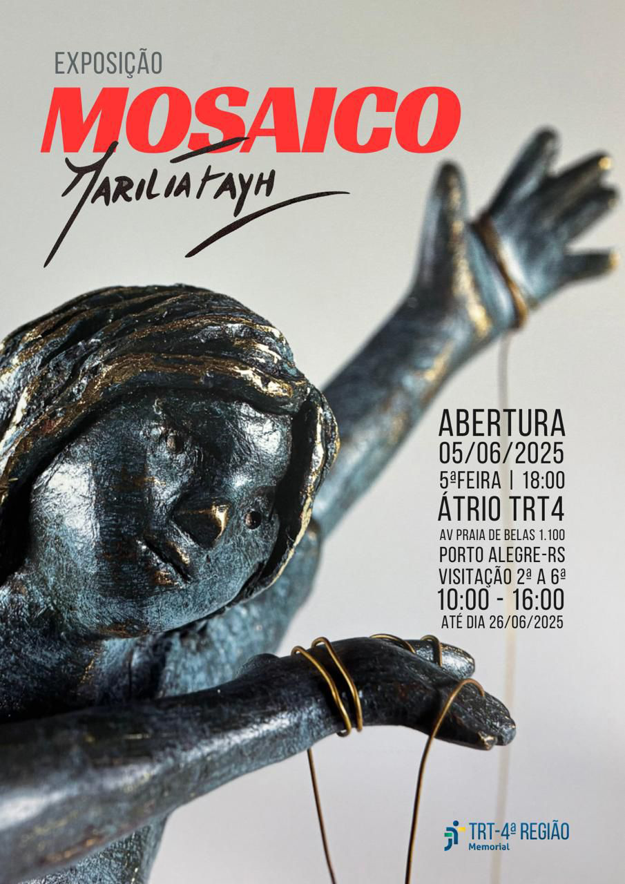 O Tribunal Regional do Trabalho da 4ª Região (TRT-RS) convida para a inauguração da exposição “Mosaico”, da artista gaúcha Marilia Fayh. A vernissage ocorrerá no dia 5 de junho, às 18h. A mostra ficará em exibição até 26 de junho, no Átrio do TRT-RS, na Av. Praia de Belas, 1.100, em Porto Alegre.